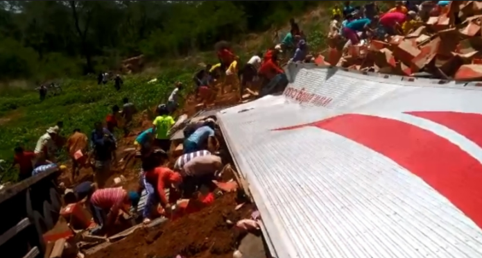 Em um vídeo, é possível ver a ação dos moradores carregando os produtos da carreta:
