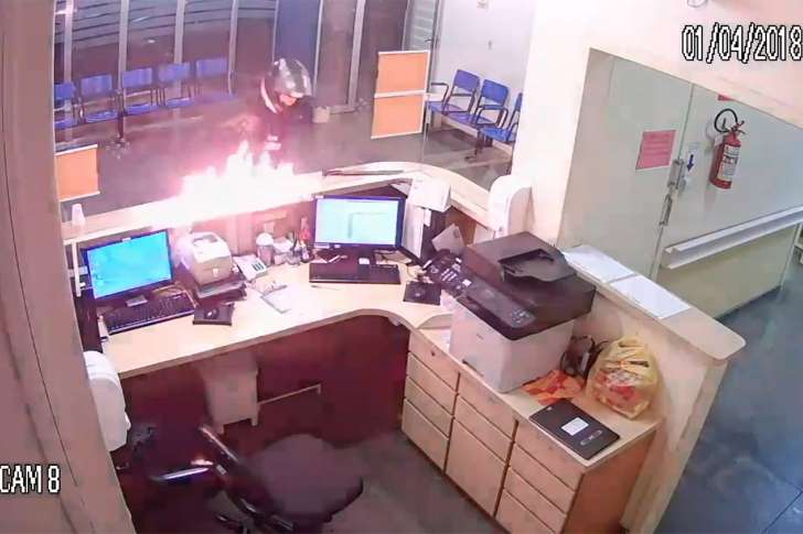 Minutos após o indivíduo retornou ao local portando um facão e uma garrafa pet de 2 litros contendo líquido combustível, que foi lançado sobre a recepção do Setor de Emergência, em direção a uma funcionária que estava em serviço e, após, ateou fogo, causando os danos descritos acima, além de inviabilizar o atendimento no setor.