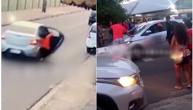 Ao tentar entrar no veículo, de modelo Prisma, cor Prata, a motorista arrancou e a vítima se segurou na porta, enquanto tinha os joelhos destruídos no asfalto.