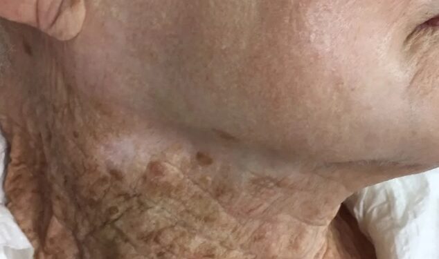 Cheek and neck of a 92-year-old female, who used UV-protective moisturizers on her face but not on the neck for 40+ years.https://t.co/Q8wWxY2tDE pic.twitter.com/FBSswmYxt1