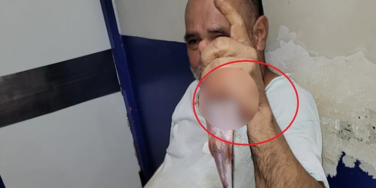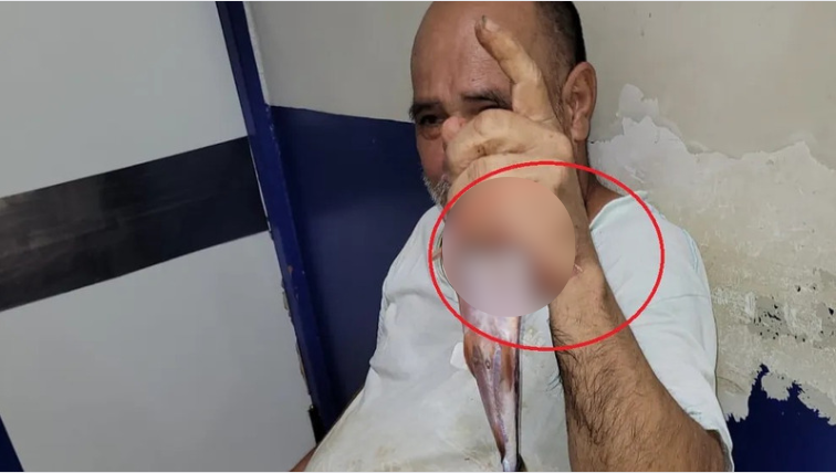 Segundo Ezequias Teixeira, 62, ele disse que o peixe ia atingir o seu rosto, mas ele levantou a mão e protegeu a face, mas acabou com o membro perfurado pelo peixe.