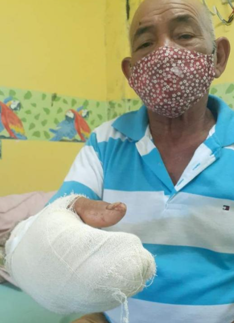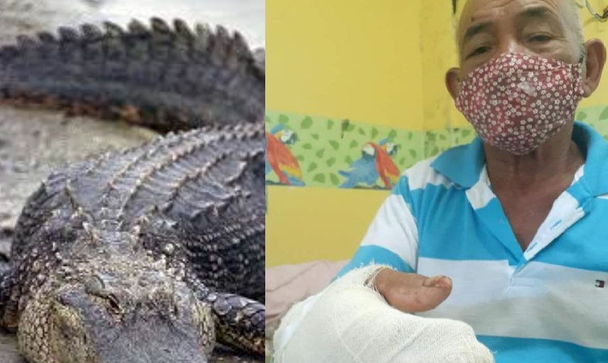 Um golpe certeiro salvou a mão desse simpático senhor conhecedor do lago Meruchinga. Apesar das fraturas, ele vai ficar bem e está vivo para contrar a história, que não é de pescador. “Quando o jacaré mordeu minha mão ainda ficou seguro por um tempo. Então eu embrulhei o ferimento e conseguiu empurrar o rabeta até Barreirinha. Saiu muito sangue, gritei por ajuda, mas não havia ninguém por ali.” Chico disse que o jacaré tinha uns 2 metros. O caso aconteceu na terça-feira (13).