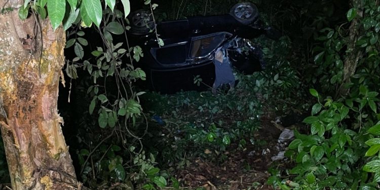 O motorista perdeu o controle do carro e foi parcialmente para fora do carro, com metade do corpo para dentro e metade do corpo para fora do veículo. Ele estava sem o cinto de segurança.