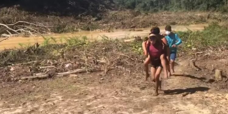 Imagens feitas por Júnior Hekurari, do Condisi-YY (Conselho Distrital de Saúde Indígena Yanomami e Ye’kuana), mostram o rapaz usando um cipó em volta da cabeça e nas costas como um mecanismo para apoiar a mulher e distribuir melhor seu peso durante a longa caminhada.