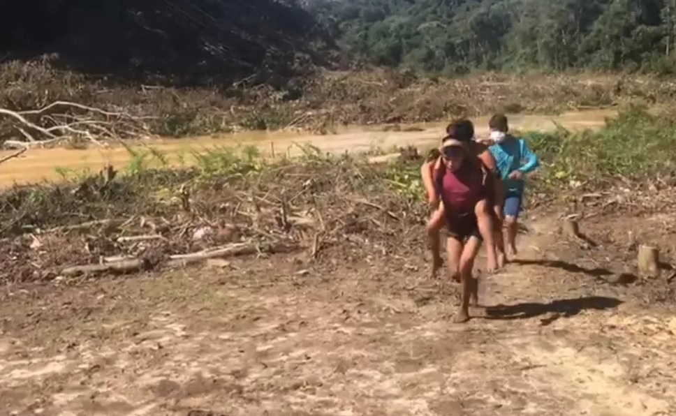 Imagens feitas por Júnior Hekurari, do Condisi-YY (Conselho Distrital de Saúde Indígena Yanomami e Ye’kuana), mostram o rapaz usando um cipó em volta da cabeça e nas costas como um mecanismo para apoiar a mulher e distribuir melhor seu peso durante a longa caminhada.