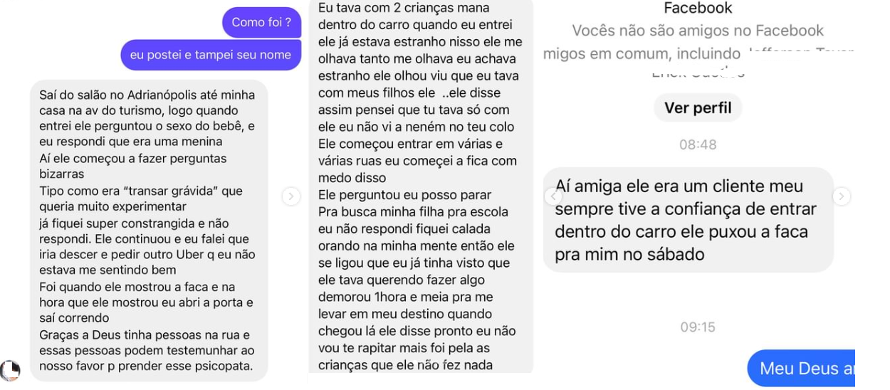 Em um dos casos, o homem pediu para ler a Bíblia enquanto cometia o crime. Uma outra mulher, que estava grávida, disse que o homem falou durante a corrida que tinha “curiosidade” em transar com uma gestante, e que a mesma só não foi abusada porque estava com os filhos.
