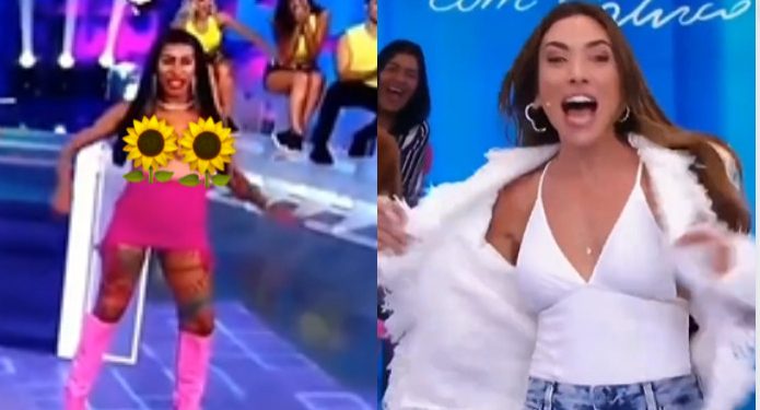 A convidada não tinha nada cobrindo os seios, mas na gravação que foi exibida ontem foi inserido emojis de flores no lugar dos seios.