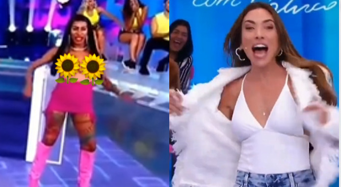 A convidada não tinha nada cobrindo os seios, mas na gravação que foi exibida ontem foi inserido emojis de flores no lugar dos seios.
