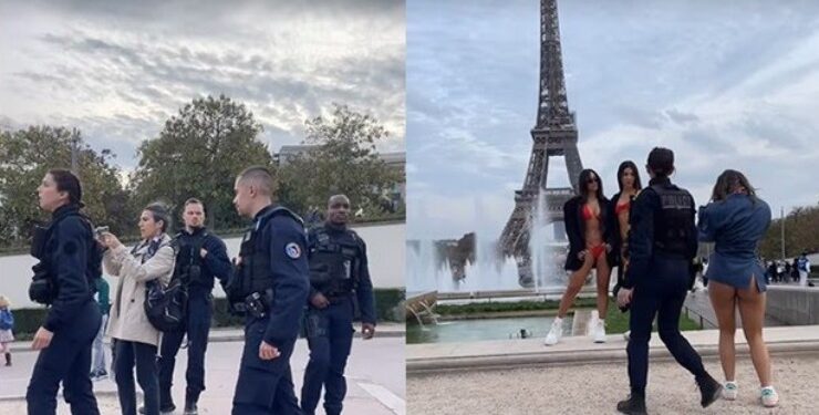 As tiktokers tentavam tirar fotos só de biquíni em frente à Torre Eiffel, um dos principais pontos turísticos do país, quando foram abordadas por policiais na frente de outros turistas.