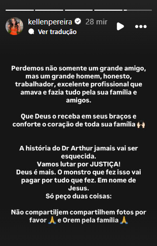 Kellen disse que todos vão lutar por justiça para que o crime não fique sem solução. “O monstro que fez isso vai pagar por tudo que fez. Em nome de Jesus”.