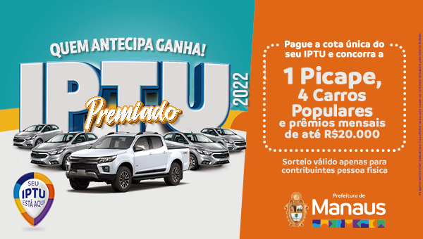 O pagamento do Imposto sobre a Propriedade Predial e Territorial Urbana (IPTU) 2022 chegou, e agora é premiado. Pagando a cota única, até 15 de março, você aproveita o desconto de 10% para imóveis residenciais e 30% para imóveis não residenciais e concorre ao sorteio de uma picape e quatro carros populares. A campanha também preparou prêmios em dinheiro para quem optar pelo parcelamento e mantiver a regularidade do pagamento, sem atrasos.