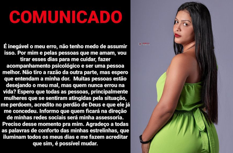 “É inegável o meu erro, não tenho medo de assumir isso. […] Não tiro a razão da outra parte, mas espero que entendam a minha dor”, diz ela.