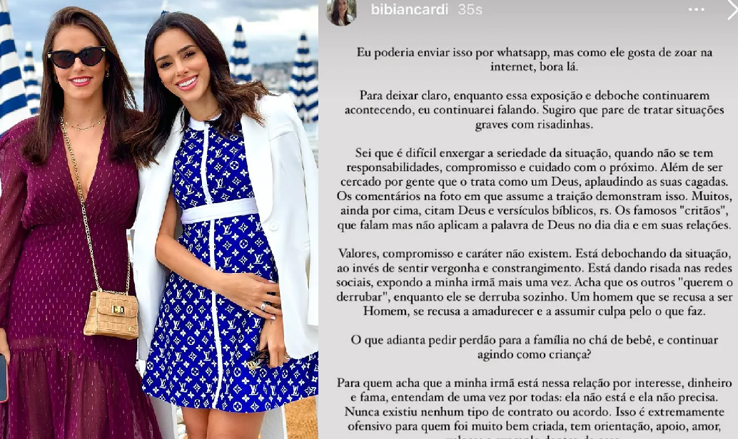 “O que adianta pedir perdão para a família no chá de bebê, e continuar agindo como criança? Para quem acha que a minha irmã está nessa relação por interesse, dinheiro e fama, entendam de uma vez por todas: ela não está e ela não precisa. Nunca existiu nenhum tipo de contrato ou acordo. Isso é extremamente ofensivo para quem foi muito bem criada, tem orientação, apoio, amor, valores e exemplo dentro de casa.”