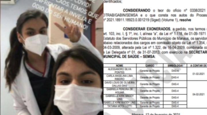 MANAUS-AM| Nesta terça-feira (12), foi confirmado que as irmãs médicas Isabelle e Gabrielle Lins foram exoneradas do cargo de gerente de projetos que ocupavam na Secretaria Municipal de Saúde (Semsa), após receberem a segunda dose da vacina contra a covid-19. Além delas, mais cinco ‘fura-fila’ também foram exonerados. O documento foi publicado no Diário Oficial do Município (DOM).