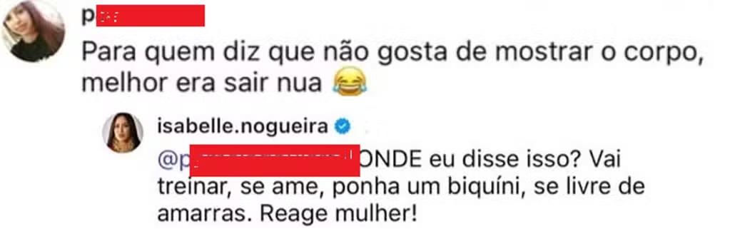 Com tom direto, Isabelle rebateu: “Onde eu disse isso? Vai treinar, se ame, ponha um biquíni, se livre de amarras. Reage, mulher”. Em seguida, ela acrescentou que raramente posta fotos para exibir o corpo. “Uma vez ou outra que eu posto uma foto de biquíni e vem querer frescar. É muita falta de amor mesmo”, completou.