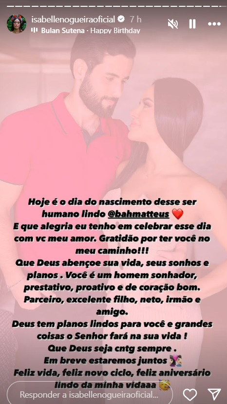 MANAUS – Isabelle Nogueira postou uma linda mensagem de amor para Matteus nesta quarta-feira (20), dia do aniversário dele, que está longe da cunhã mas ganhou uma postagem romântica de admiração.