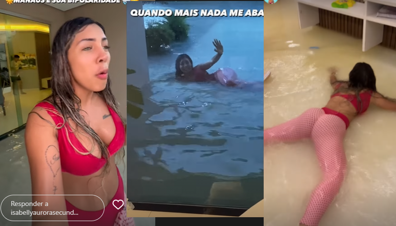 Nas redes sociais, ela mostrou a sala, cozinha e outros cômodos invadidos pela água. Com bom humor, ela não ficou desesperada e chegou a nadar na sala e ainda na frente da residência. “O que é um peido pra quem tá cagado? Se você abrir a porta, vai entrar o rio todinho aqui em casa e a gente não pode porque tem que dividir com os vizinhos, né?”, disse ela, debochando da situação.