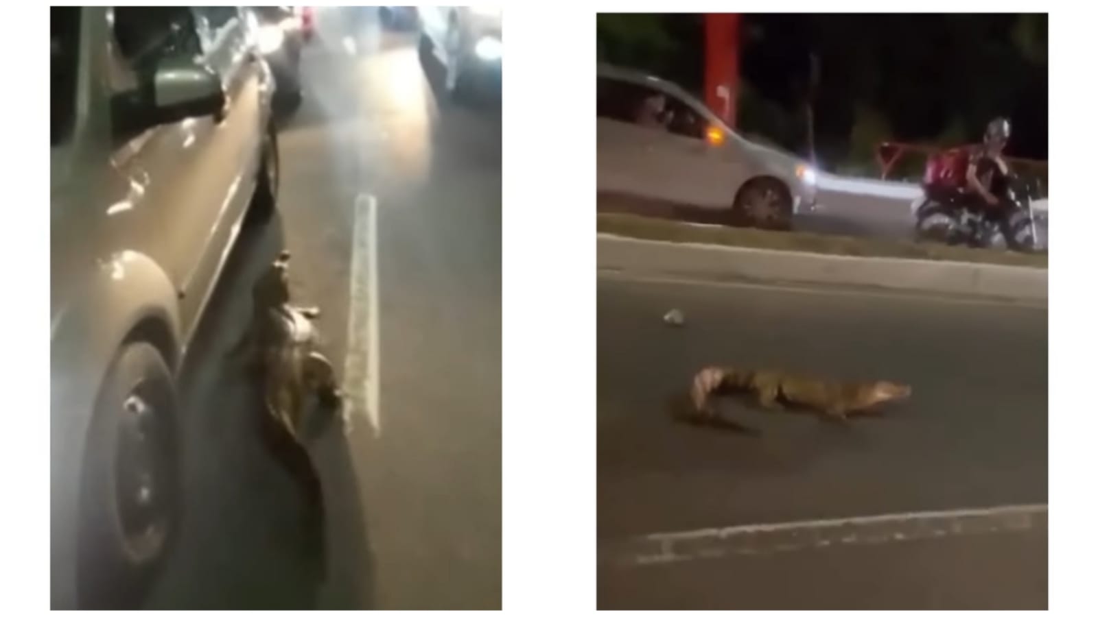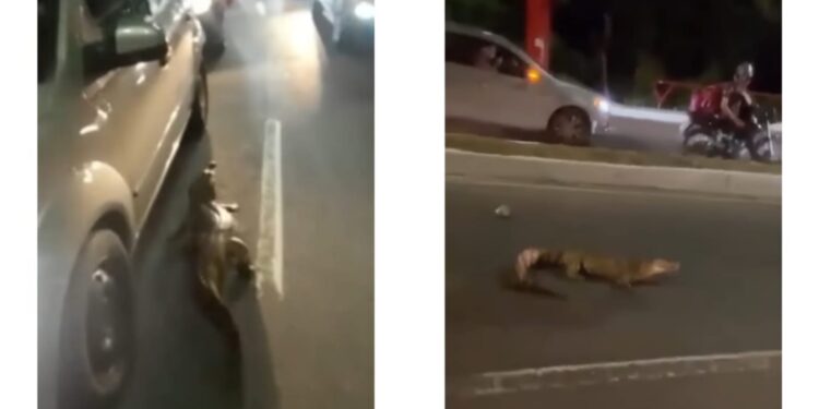 MANAUS – AM | Um jacaré foi flagrado passeando no meio de uma avenida movimentada em Manaus, na noite deste domingo (17).