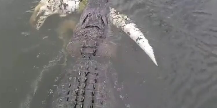 MANAUS, AM – O vídeo de um jacaré ostentando restos mortais de uma presa viralizou nas redes sociais dos amazonenses nesta segunda-feira. Com mais de três metros de cumprimento, o caçador da Amazônia atravessa as águas poderoso.