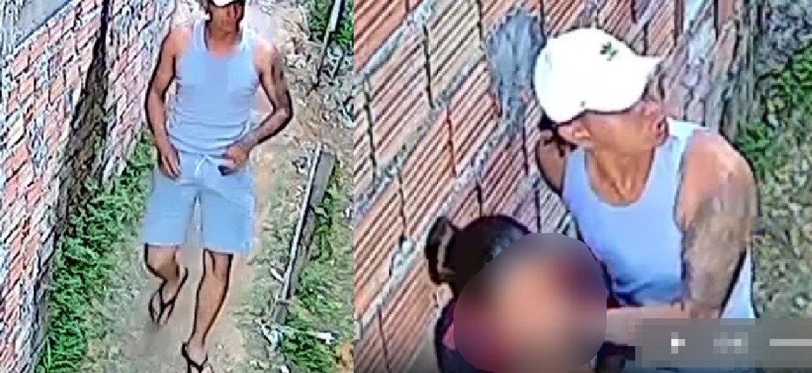 Nas imagens, é possível ver a mais velha saindo com uma criança que está de uniforme. A menor vai na frente e a vítima logo atrás. É quando o agressor desce o beco correndo, já com as mãos nas partes íntimas.