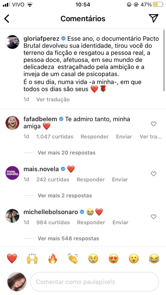Uma selfie da esposa de Guilherme com Michelle vazou nas redes sociais. Nesta semana, a primeira-dama chegou a postar um emoji de tristeza em postagem da autora, que falava sobre o documentário “Pacto Brual”, da morte da filha, lançado recentemente.
