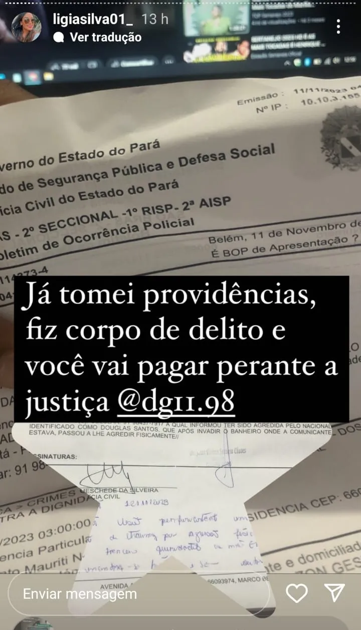 “O Douglas invadiu o banheiro onde eu estava e me agarrou, me agrediu, arrancou meu cabelo, unha e partiu meu beiço. Só não apanhei mais porque fui forte e ainda conseguir lutar com ele, mas minha força é incomparável com a dele”, contou.