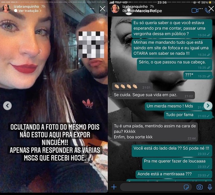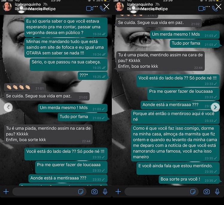 Além de explicar a situação, Iza postou diversos prints de conversas no WhatsApp com Felipe, nos quais cobra uma posição sobre o que havia acabado de descobrir. “Eu igual uma otária sem saber de nada”, desabafou. Ao confrontá-lo, ouviu, como resposta: “Segue sua vida em paz”.
