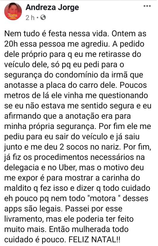 A jornalista conta que após se justificar, o homem mandou a mesma sair do veículo e lhe deu dois socos no nariz. “Já realizei os procedimentos necessários, junto à delegacia e no Uber. Meu relato é apenas para expor essa pessoa e alertar que todos tenham cuidado com esse ‘motora’ nada legal. Passei por esse livramento, mas ele poderia ter feito muito mais. Então mulherada todo cuidado é pouco”, concluiu a jornalista em sua postagem.