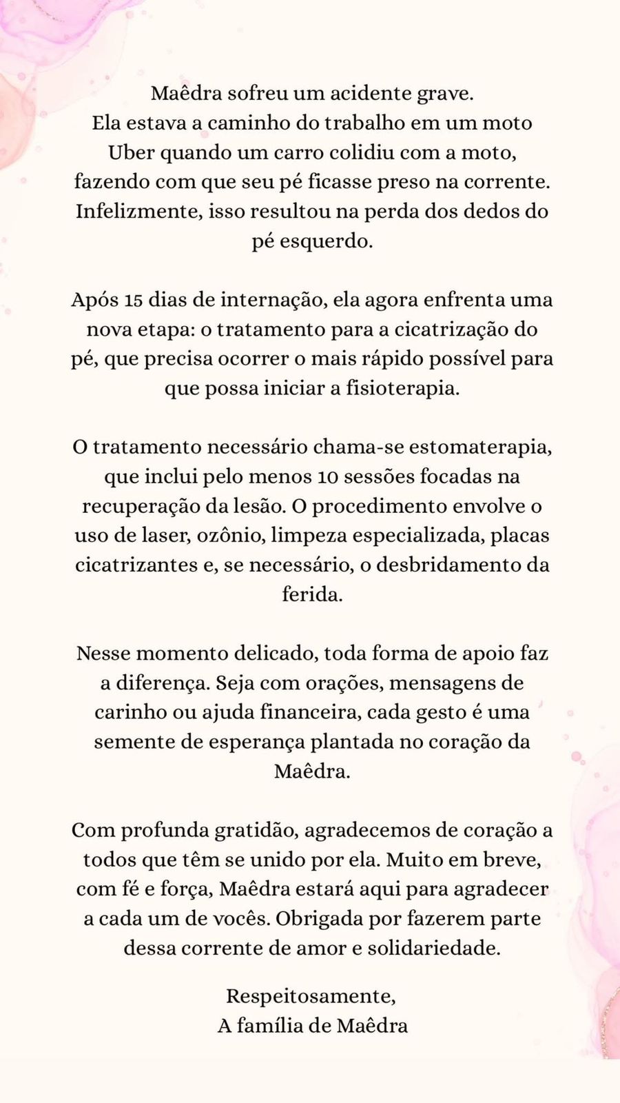 Segundo a família, em comunicado nas redes sociais, eles ficaram presos na corrente da motocicleta. Maêdra estava indo de transporte por aplicativo. Depois de permanecer 15 dias hospitalizada, ela agora inicia uma delicada fase de tratamento especializado.