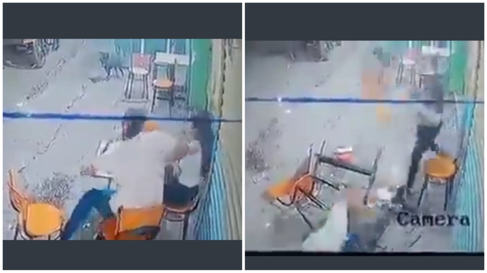 O casal conversava, sentados à mesa da lanchonete, quando o homem tenta acertar o rosto da esposa, que reage de forma inesperada. Ela levanta e começa a encher o homem de socos, deixando o agressor sem reação. Para completar, ela pega uma das cadeiras e arremessa no homem, que sai do local.