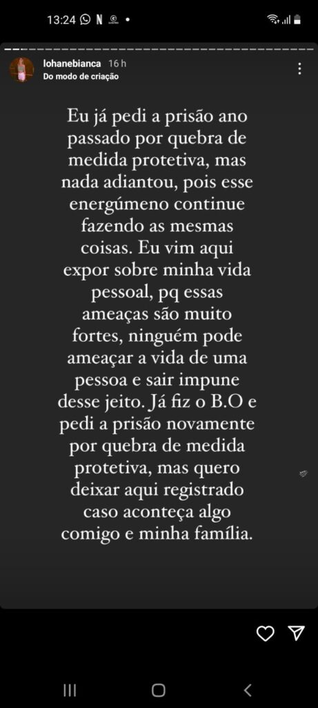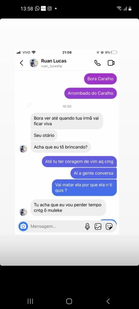 O suspeito, identificado como Ruan Lucas, não aceita o fim do relacionamento e está há mais de um ano perseguindo a vítima. Segundo ela, Ruan já criou vários fakes e, mesmo tendo entrado com medida protetiva contra o suspeito, nada adiantou. Até mesmo o irmão de Lohane chegou a confrontar o suspeito, que não se intimida.