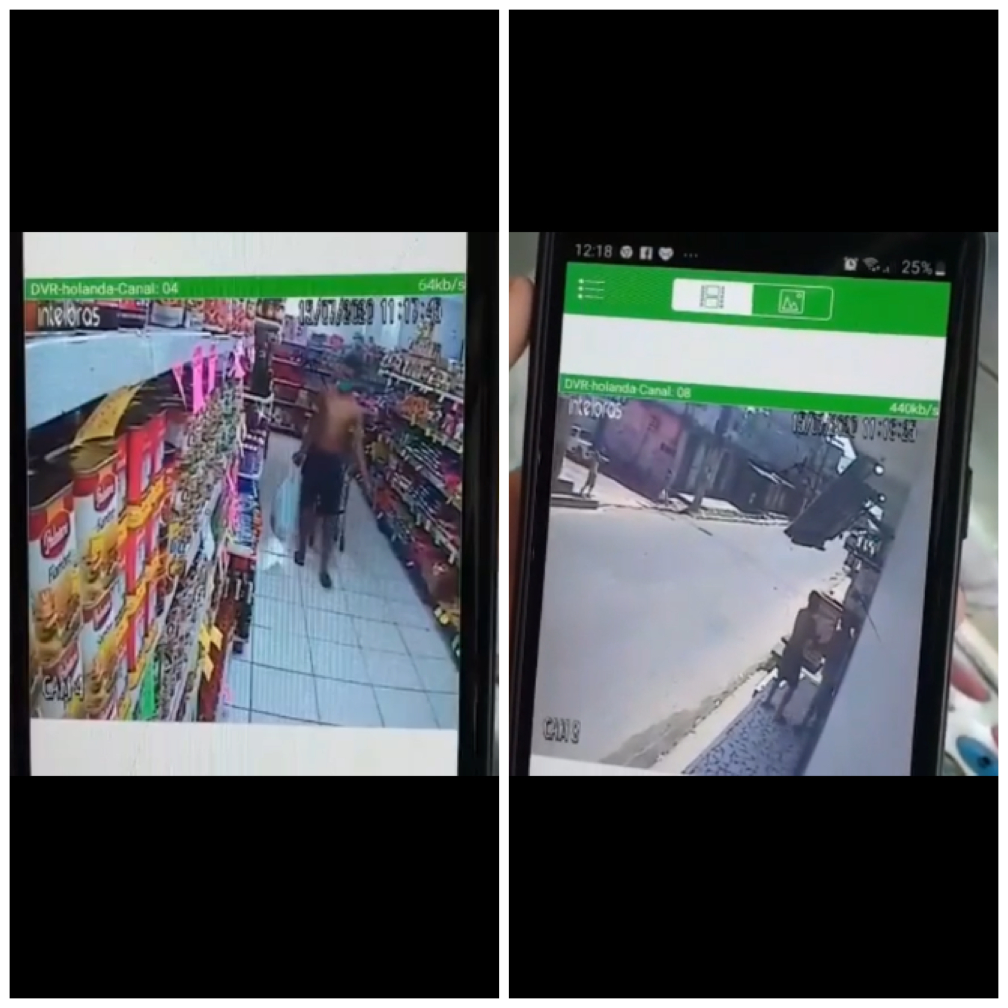 Toda ação foi registrada por câmeras de segurança do estabelecimento, que mostram o rapaz com duas sacolas, e dentro do comércio começa a subtrair os produtos.
