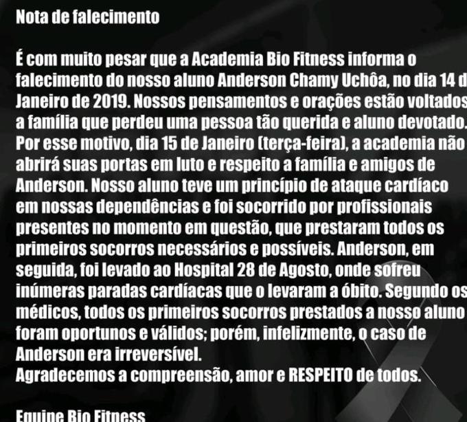 Em nota publicada no seu perfil oficial em uma rede social, a academia Bio Fitness lamentou o ocorrido. As atividades no local foram suspensas após a morte do aluno.