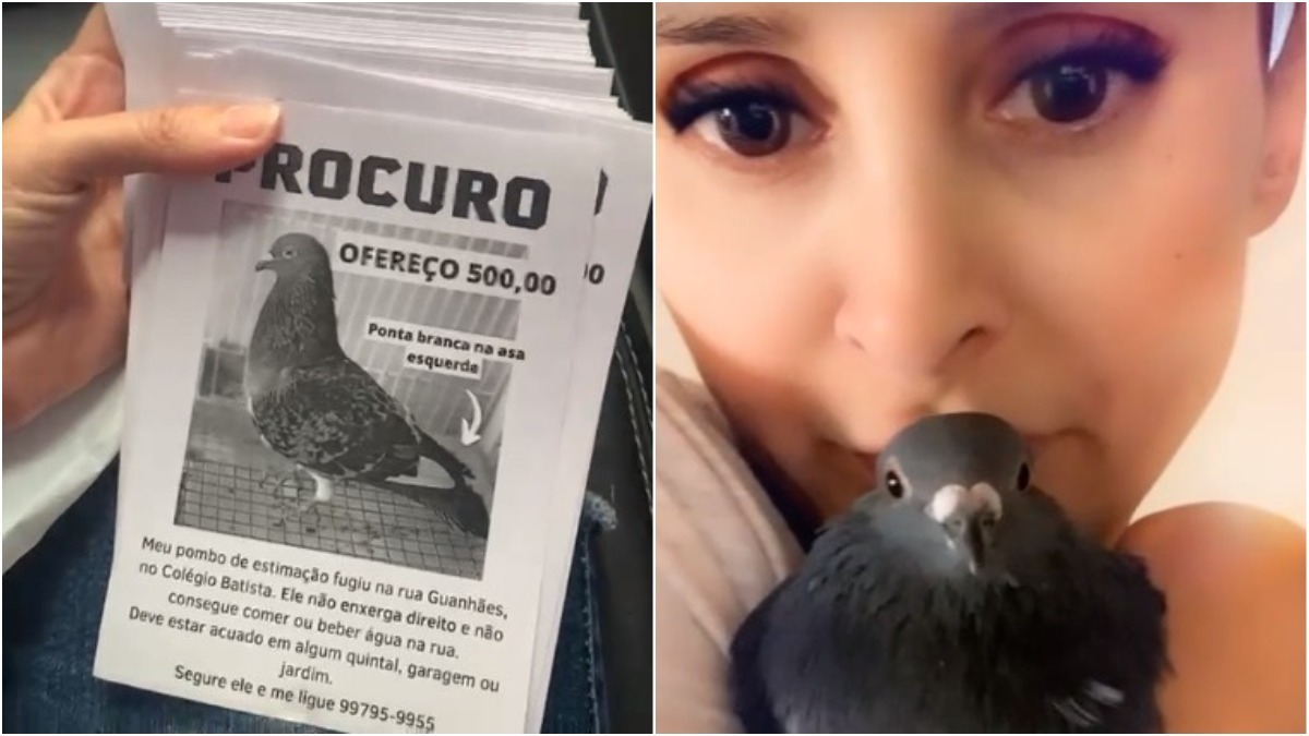 É que se trata do sumiço de Anjo, o pombo de estimação da publicitária Brena Braz. Ela oferece a recompensa simbólica de R$ 500 a quem o levar de volta para casa. Anjo tem um problema de visão e precisa de cuidados especiais.