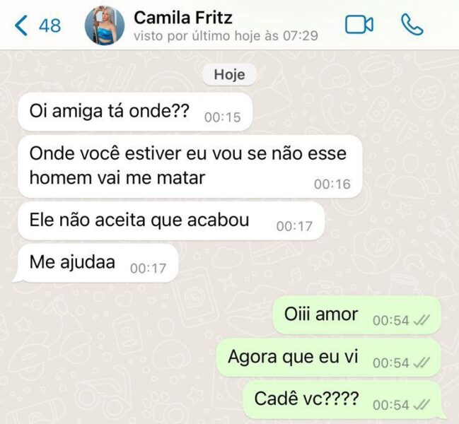 Um print da conversa feita por aplicativo de mensagem mostra que Camila estava temendo ser morta. “Onde você estiver eu vou se não esse homem vai me matar”, escreveu ela por volta de meia-noite.