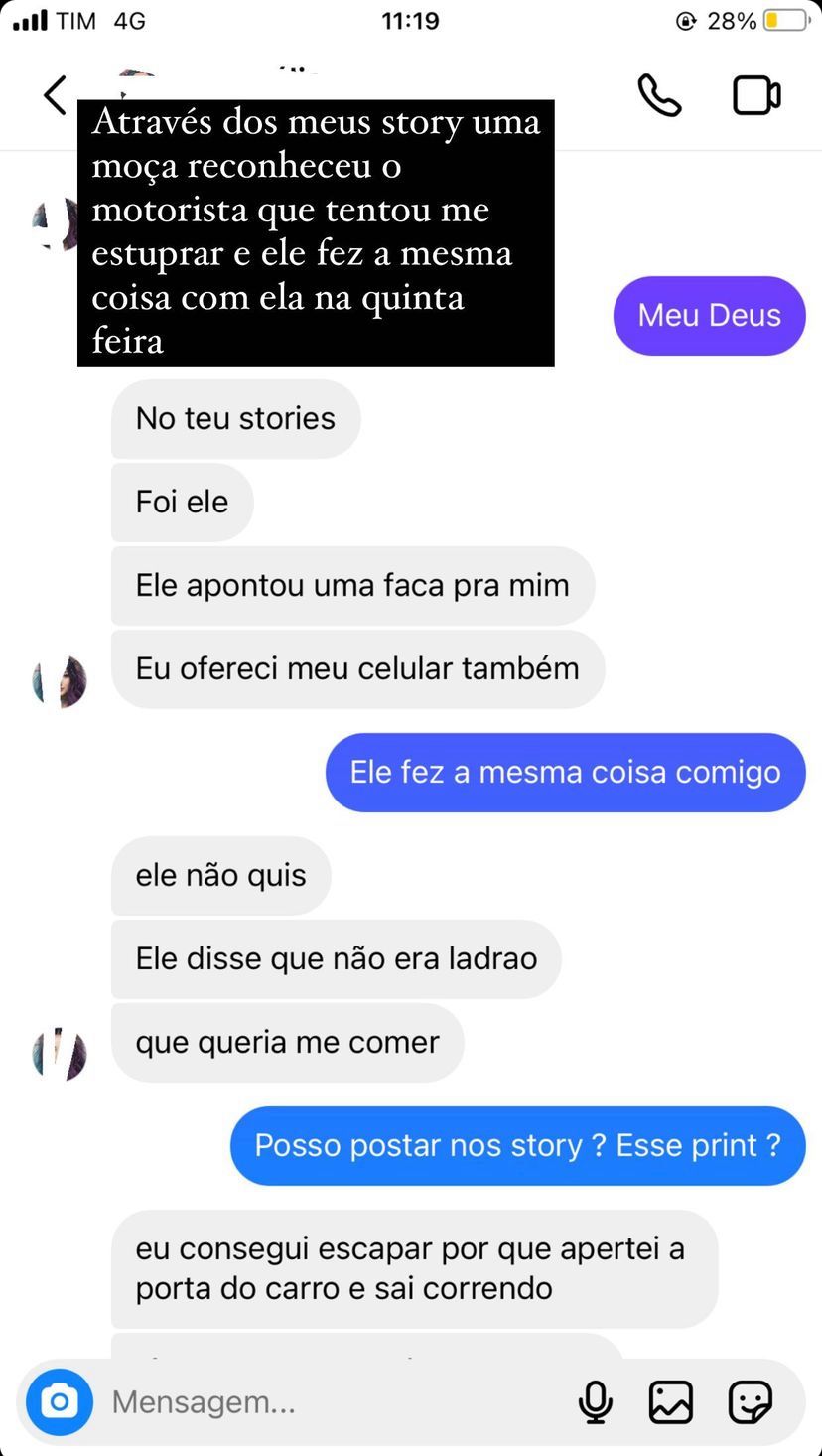 Nesta segunda-feira, Ingrid contou que outra moça reconheceu o homem e disse que fez o mesmo com ela na última quinta-feira (14). A vítima, assim como Ingrid, ofereceu o celular, mas ele não quis pois disse que não era ladrão. “(disse) que queria me comer”, diz ela, em trecho de conversa postado no Instagram.