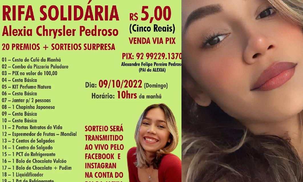 A rifa custa R$ 5 e serão sorteados 20 prêmios e mais um prêmio surpresa. O sorteio acontece no dia 9 de outubro, com transmissão ao vivo pelas redes sociais do pai de Alexia. Mais informações pelo número 92 99229-1370.