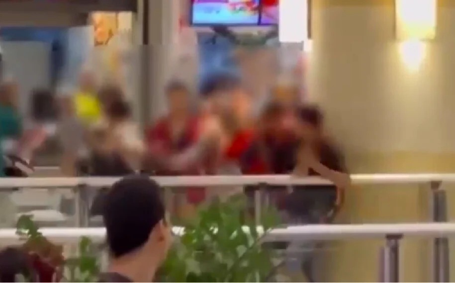 Um vídeo gravado por outros frequentadores mostra o momento em que o grupo provoca uma briga generalizada dentro da praça de alimentação, trocando chutes, socos e até ‘capacetadas’.