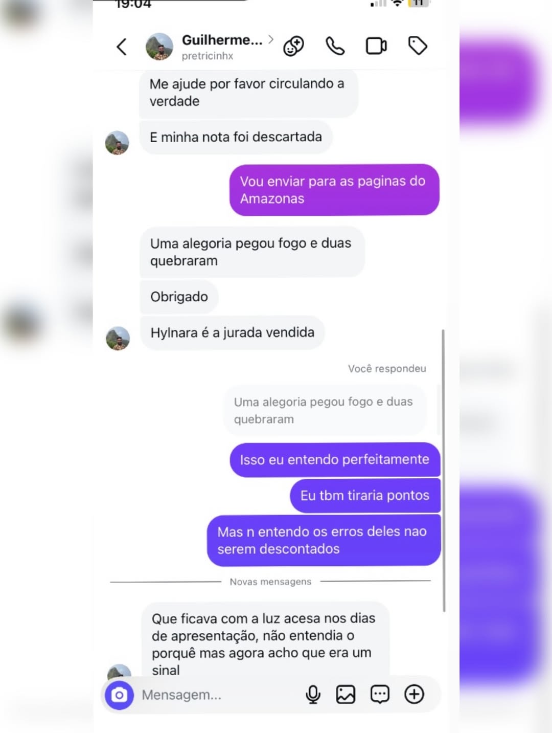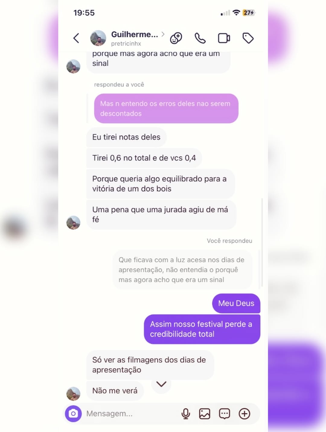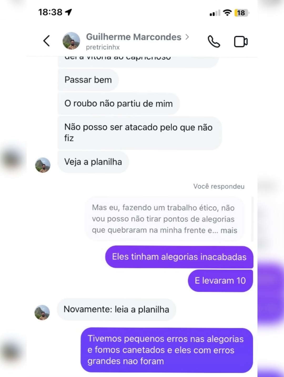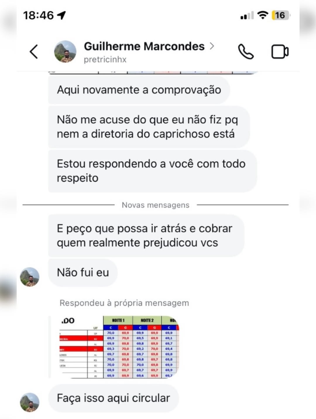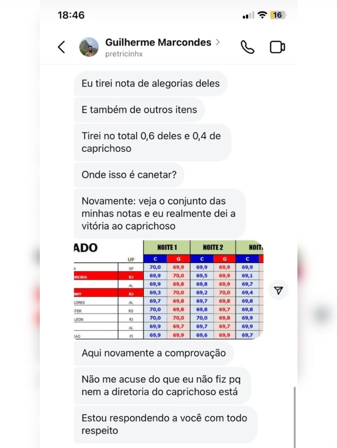 “Eu dei a vitória ao Caprichoso. O roubo não partiu de mim. Não posso ser atacado pelo que não fiz”, defende-se Marcondes nas mensagens. O jurado afirma ainda que não deu notas máximas ao Garantido conforme o que ele mesmo avaliou, mesmo que de forma ponderada: “Tirei 0,6 no total e de vocês 0,4 porque queria algo equilibrado para a vitória de um dos bois”.