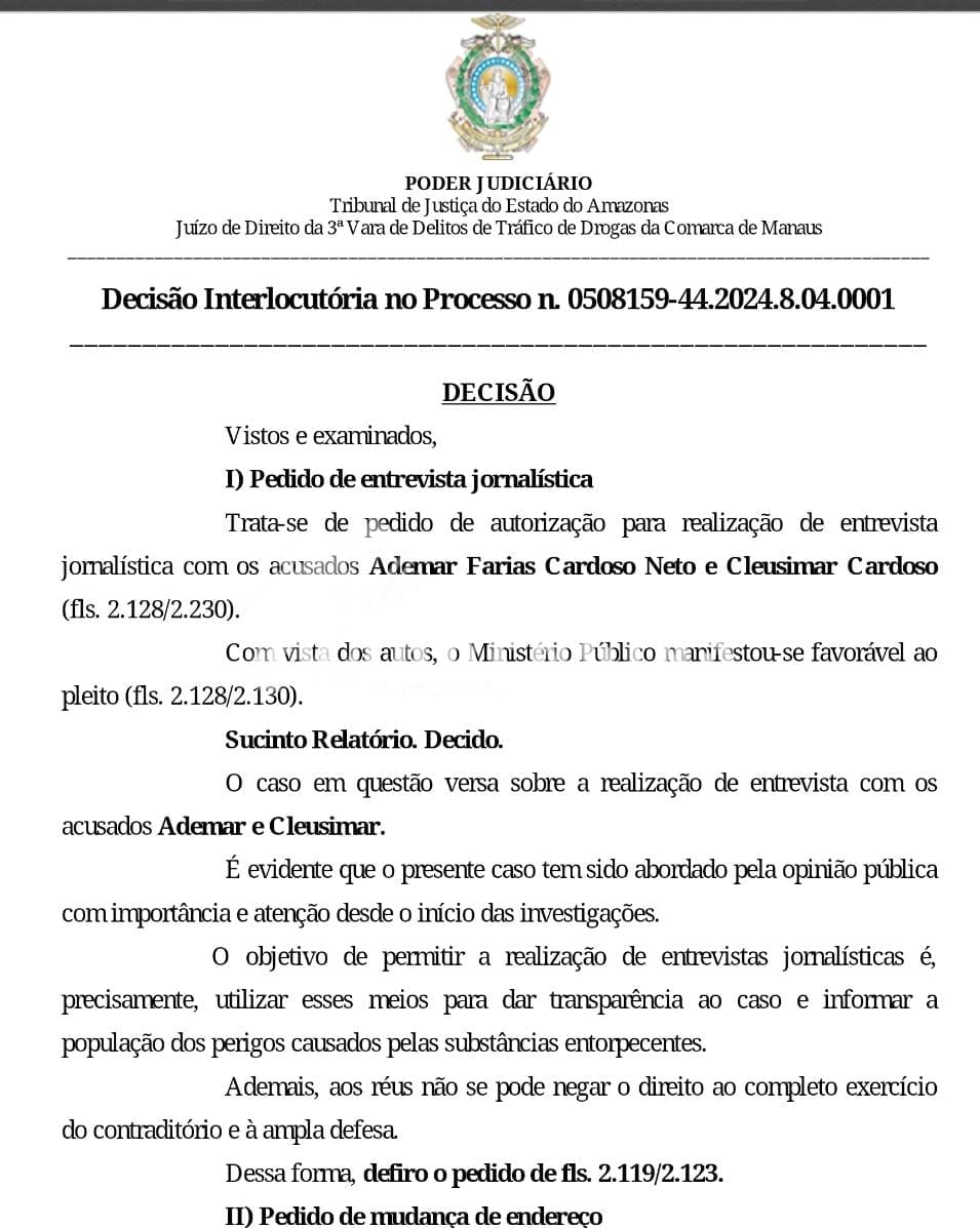 MANAUS (AM) – O juiz Celso Souza de Paula, da 3ª Vara de Delitos de Tráfico de Drogas da Comarca de Manaus autorizou um pedido do jornalista investigativo Roberto Cabrini, da Record TV, para entrevistar Ademar Cardoso Neto e Cleusimar Cardoso. O irmão e a mãe de Djidja Cardoso faziam parte da seita “Pai, Mãe, Vida” e estão presos desde o dia 30 de maio por vários crimes referentes ao uso do anestésico Cetamina, que causou a morte da ex-sinhazinha do boi Garantido.