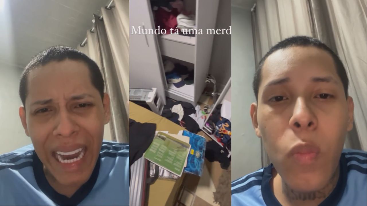 “Ai rapaziada, bagunçaram tudo mano, meu guarda-roupa tá todo quebrado aqui ó. Levaram metade das minhas roupas mano, acho que levaram mais de mil reais em roupas. Tem roubas que eu nem usei”, diz o rapaz.