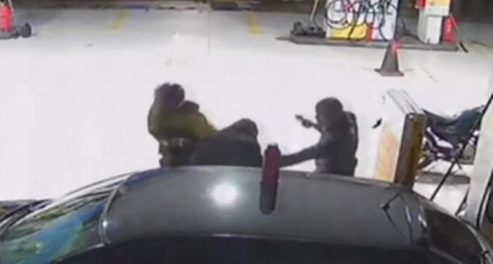 As câmeras de segurança do estabelecimento registraram o momento em que dois homens chegam de motocicleta para assaltar o local. Durante o roubo, um dos assaltantes começa a agredir o frentista, mas o outro tenta intervir e acaba disparando um tiro, aparentemente acidental, contra o colega.