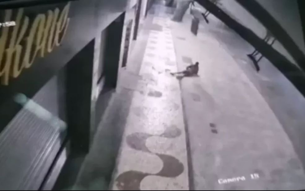 No vídeo registrado por câmeras de segurança da região, o ladrão aparece despencando do segundo andar, caindo com a parte da frente do corpo no chão. Logo em seguida, a televisão também cai, bate em um toldo, e depois atinge a cabeça do homem, que ainda consegue se levantar e levar o aparelho nos braços, mesmo mancando.