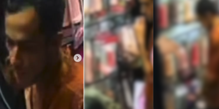 Nas filmagens divulgadas pela empresa, o homem aparece em frente a um paredão de consolos, ele pega, olha, escolhe a cor e aprecia os tamanhos, separam um, que em seguida, ‘disfarçadamente’, ele enfia embaixo da blusa.