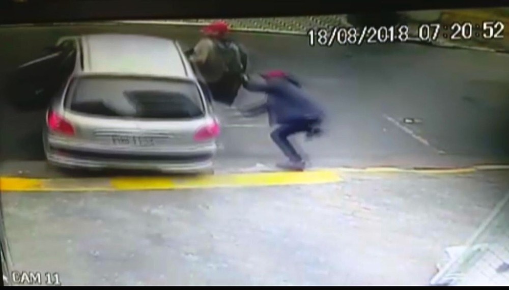 São Paulo – Imagens da câmera de uma circuito de segurança registraram o desfecho bizarro de um assalto a um prédio luxo localizado Praia Grande, no litoral Paulista.
