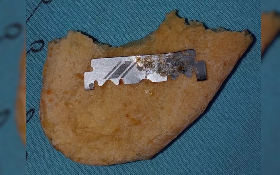 GOIÁS | A moradora Solange Dias denunciou que achou uma lâmina de barbear dentro de um pão de queijo em Anápolis, a 55km de Goiânia. O marido dela, o borracheiro José Souza, contou que comprou o lanche em um supermercado e a mulher chegou a dividir com a filha, de 2 anos, sem saber do perigo.