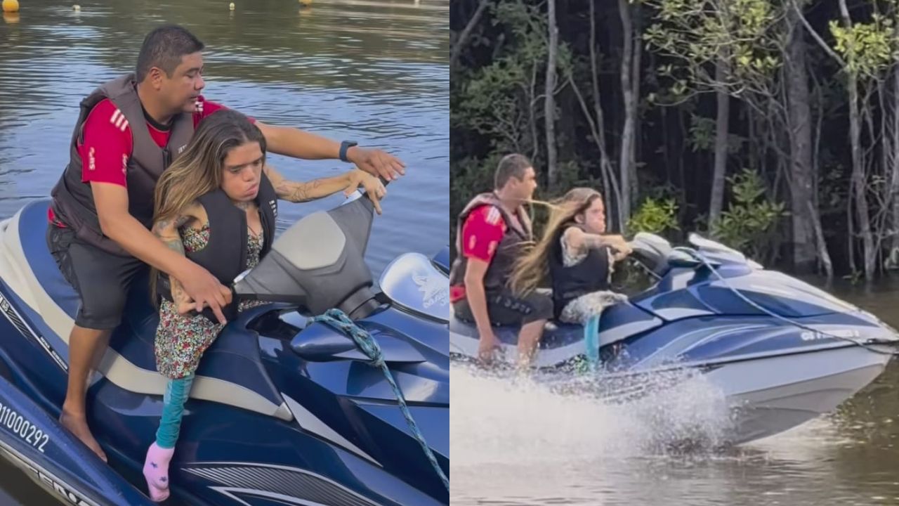 Leandrinha Du Art está passando as férias em Manaus e resolveu tirar onda andando de jet ski no rio Amazonas.