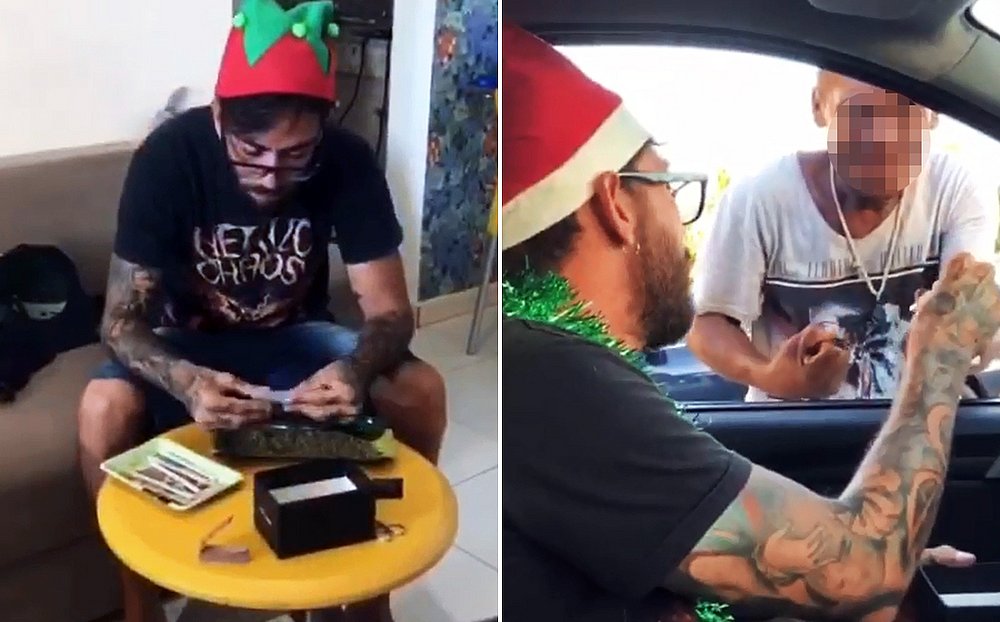 Na imagem seguinte, Tássio aparece dirigindo pela orla de Salvador. Ele para o carro e oferece os cigarros já bolados para pessoas aleatórias que caminham na região. “Rapaz, você tirou minha cara hoje e amanhã”, diz um dos agraciados pelo “presente”. Antes, em deboche, o homem havia emendado um “Ho Ho Ho”. Tássio acompanha a risada característica de Noel fingindo tossir, como se tragasse uma fumaça imaginária.