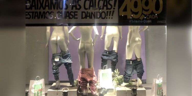 Manequins foram expostos com calças colocadas até os joelhos e, no vidro, foram coladas frases chamativas como “estamos quase dando”, que fazem menção a um contexto sexual.