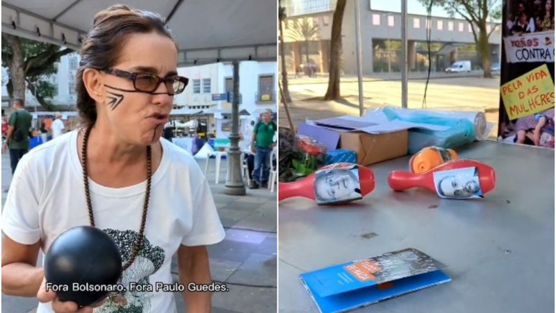 Quando os pinos são derrubados, ela comemora e ri: “Acabou tudo!”. Além disso, na legenda da publicação, a artista acrescenta: “Derrubando Bolsonaro, Paulo Guedes e Ricardo Salles numa cajada só!”.